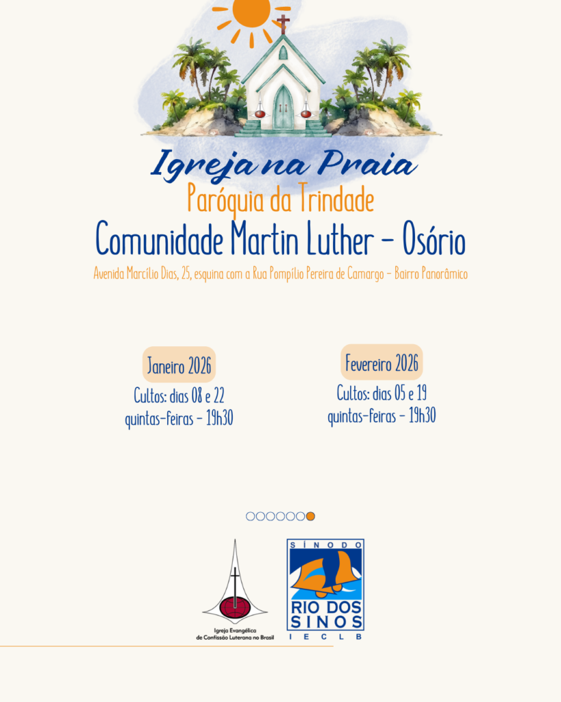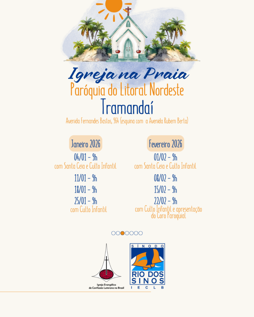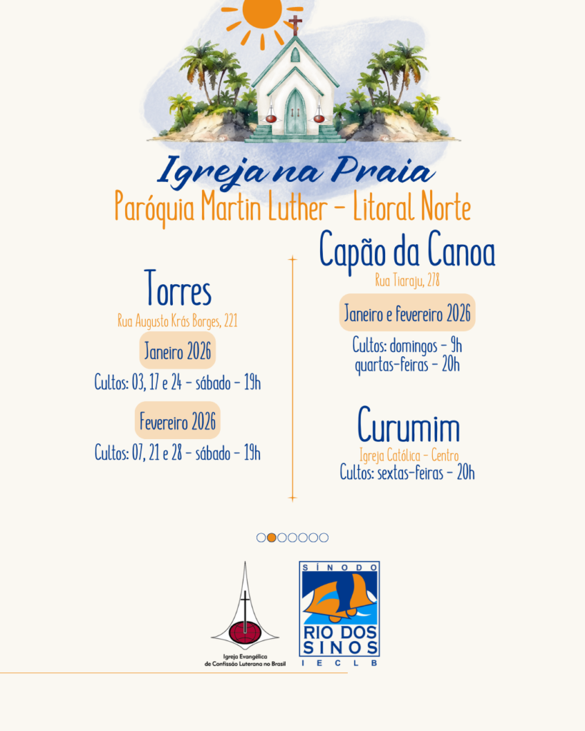 Confira as programações das paróquias Trindade – Osório; Litoral Nordeste – Tramandaí, Mariluz e Pinhal; e Martin Luther – Litoral Norte (Torres, Capão da Canoa e Curumim) e venha participar desses encontros especiais!