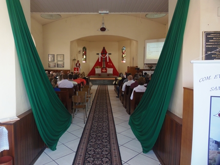 Já no domingo, 10/04, aconteceu o culto festivo pelos 150 anos. Neste dia a comunidade esteve reunida e pode celebrar festivamente a sua história dando graças a Deus pela caminhada. Deste momento participaram o Pastor Presidente Nestor Friedrich, o Pastor Sinodal Bruno Ari Bublitz, os pastores Ivário Fries e Marcos Bechert, que atuaram na comunidade em anos anteriores, além do Pastor Reinoldo G. Neumann, responsável pelos trabalhos atualmente, e do Ministro Candidato Renan Schlemper, que faz seu PPHM em Santa Maria. O culto foi um momento muito especial, no qual foram feitas varias homenagens. Uma destas homenagens foi prestada pela comunidade a Ruth Rempel, viúva do P. Benno Rempel, que assim como os demais pastores presentes, recebeu um exemplar do livro da comunidade. Após o culto aconteceu um almoço de confraternização no salão comunitário.