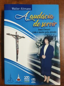(no video, irmã Ruthild mostrando um artefato indígena ao falar sobre a vida em Moçambique/Africa, quando ela visitou irmã Doraci que trabalhou lá por muitos anos, se você se interessou nessa história pode ler e aprender mais no livro do P. Walter Altmann/na foto em azul).