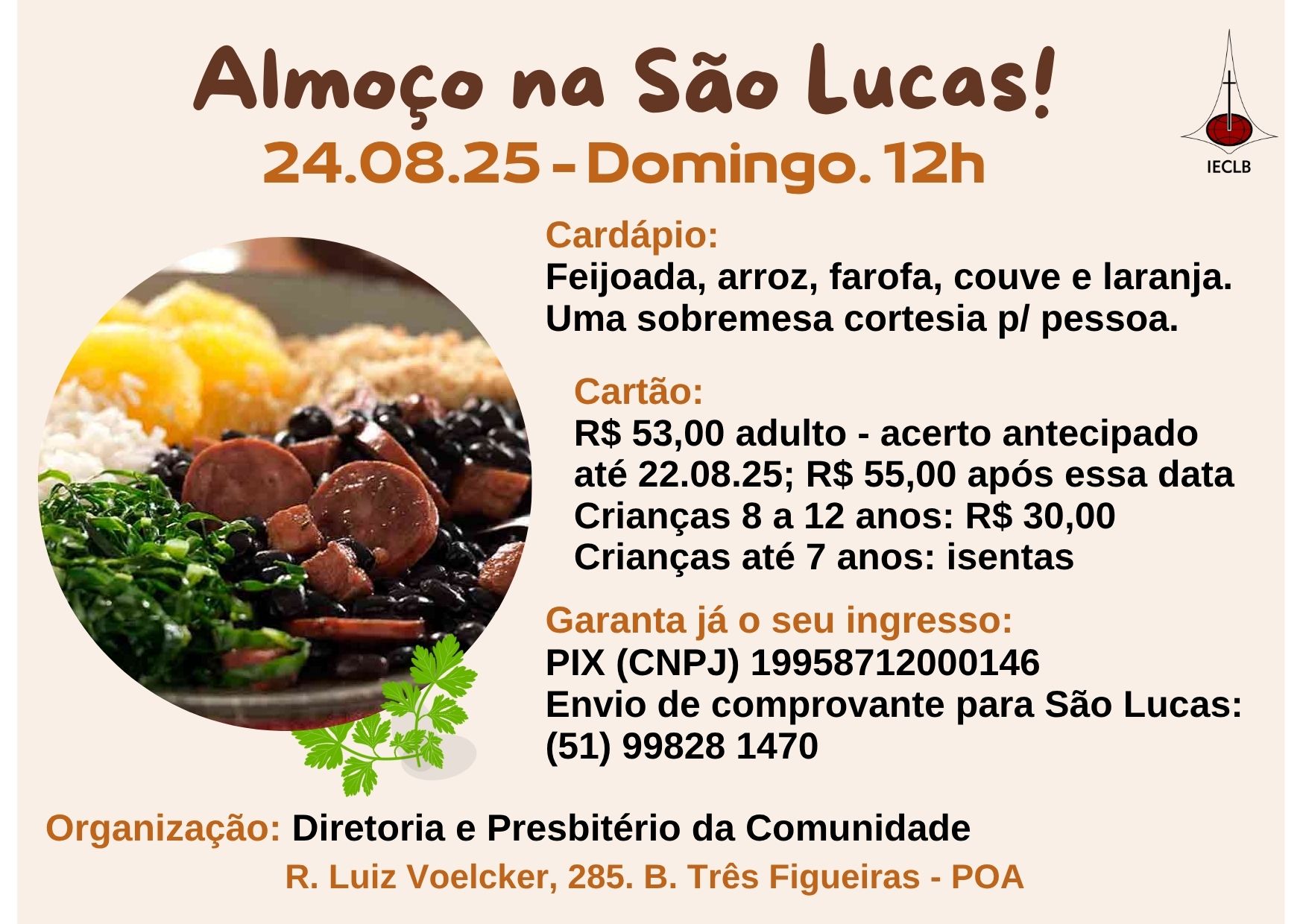 E para marcar de forma especial os 11 anos da Pastoral do Cuidado e os 61 anos da Comunidade São Lucas, ao meio-dia haverá o almoço festivo. No cardápio, feijoada, arroz, farofa, couve e laranja, além de uma sobremesa cortesia por pessoa.