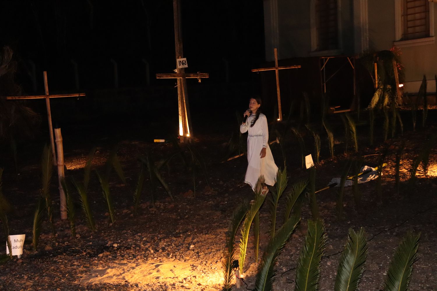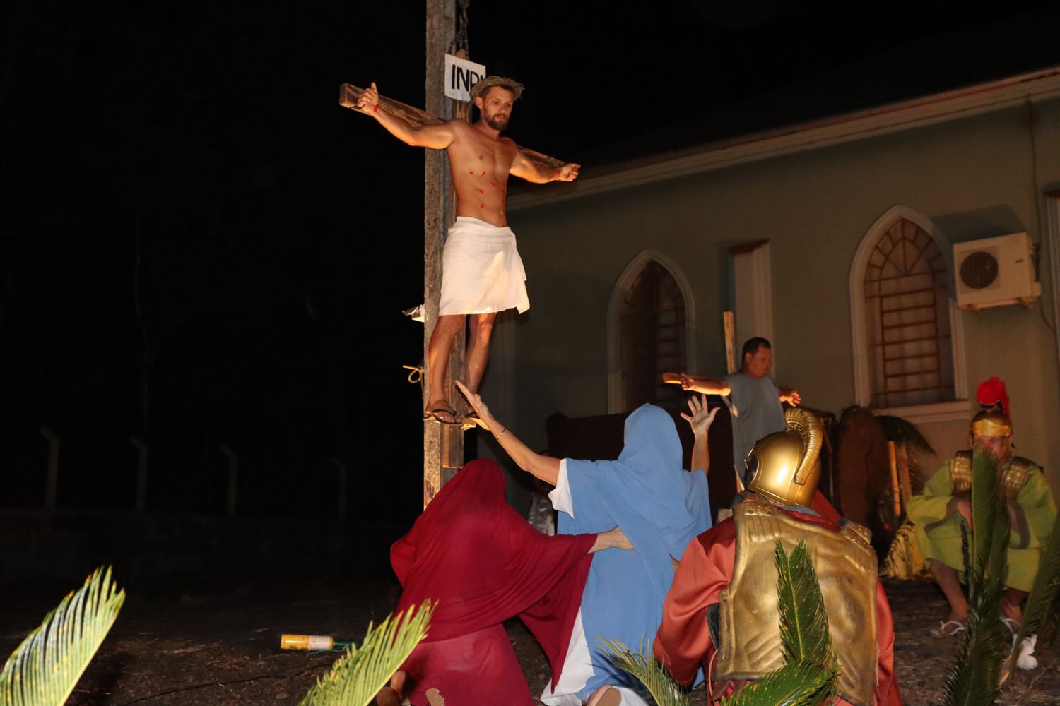 A encenação seguiu mostrando Jesus e seus discípulos no Getsêmani, sua prisão e julgamento por Pilatos. Depois veio o percurso com cruz nas costas, o encontro com a mãe e a ajuda para carregar a cruz. A crucificação, com efeitos sonoros e visuais, prendeu a atenção do público. Posteriormente, ainda houve destaque para a ressurreição.