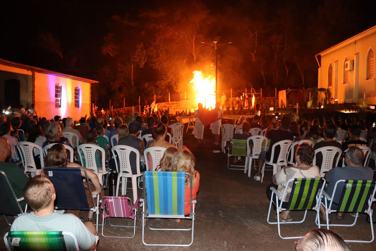 Ao final da encenação, a jovem Amanda Fritsch cantou a música Aleluia, momento em que também houve o acendimento da fogueira e do Círio Pascal, simbolizando o fogo novo, ou seja, a luz de Cristo ressuscitado que vence a escuridão. Ainda houve um momento de meditação conduzido pelo pastor Gerson e pela pastora Cristiane Echelmeier.