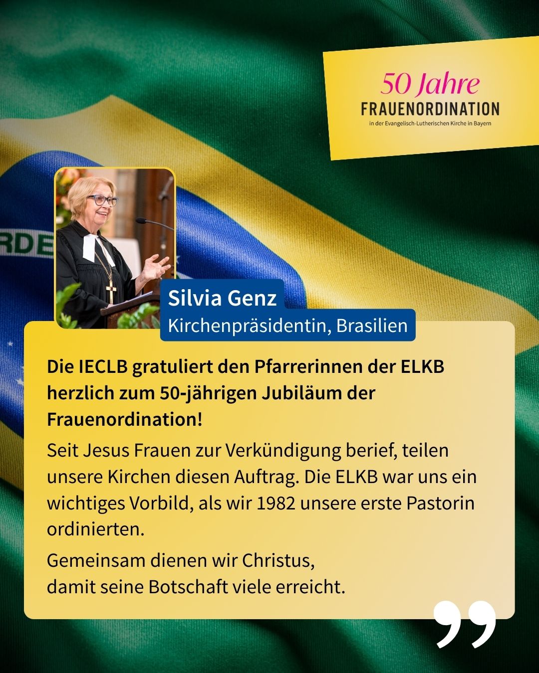 Em mensagem, publicada em alemão, no formato de card, Pastora Silvia expressa: “A IECLB parabeniza cordialmente as pastoras da Igreja Evangélica Luterana na Baviera pelo jubileu de 50 anos da ordenação feminina! Desde que Jesus chamou mulheres para a proclamação, nossas igrejas compartilham essa missão. A Igreja da Baviera foi para nós um importante modelo quando, em 1982, ordenamos nossa primeira pastora. Em conjunto servimos a Cristo, para que sua mensagem alcance muitas pessoas.”
