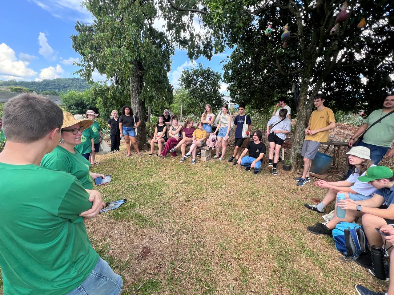 Na tarde do dia 11, os intercambistas conheceram a Horta Comunitária de Teutônia, uma iniciativa de economia solidária que ocorre em uma área da Comunidade Evangélica de Confissão Luterana Redentor, na Paróquia Teutônia Sul – Sínodo Vale do Taquari. O grupo foi recepcionado pelas pessoas voluntárias que atuam no espaço e pode conhecer o funcionamento da horta, que segue os princípios da agroecologia e respeitando a flora dos biomas Pampa e Mata Atlântica.