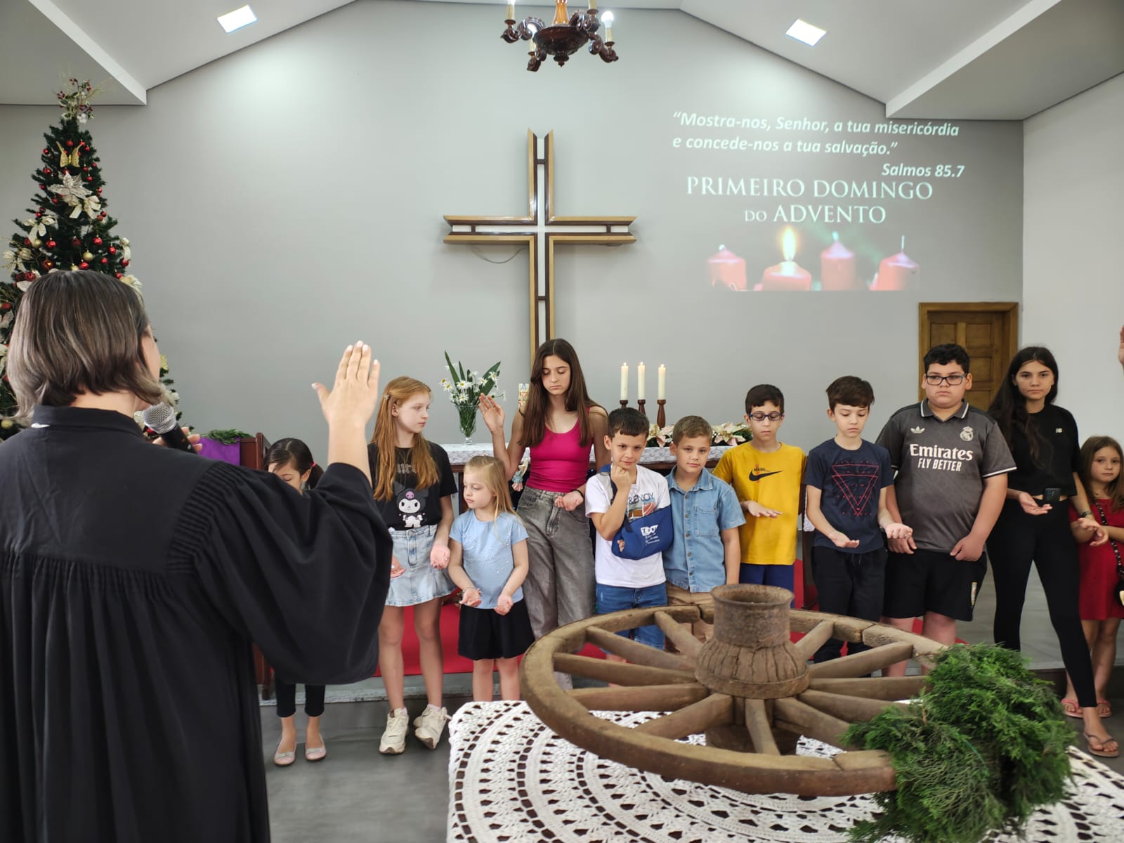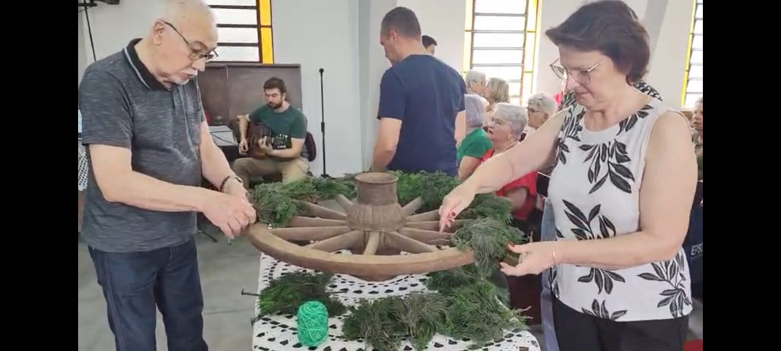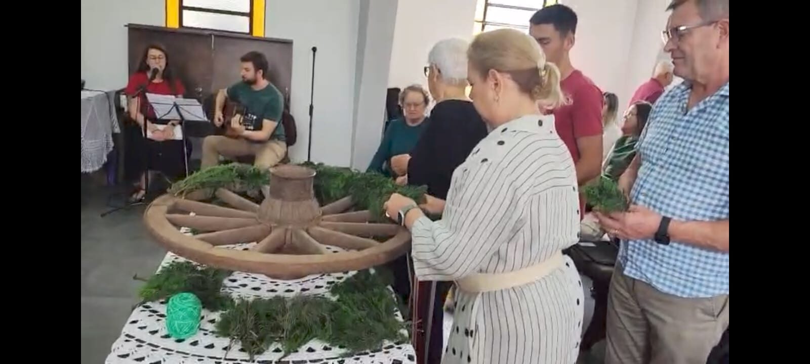 Durante o culto, a comunidade confeccionou, coletivamente, a coroa de Advento, utilizando uma roda de carroça, inspiração trazida a partir da história compartilhada na Oficina de Advento e Natal da IECLB. A proposta, que resgata simbolismos e tradições, aproximou gerações e reforçou o sentido de preparação para a chegada de Cristo.