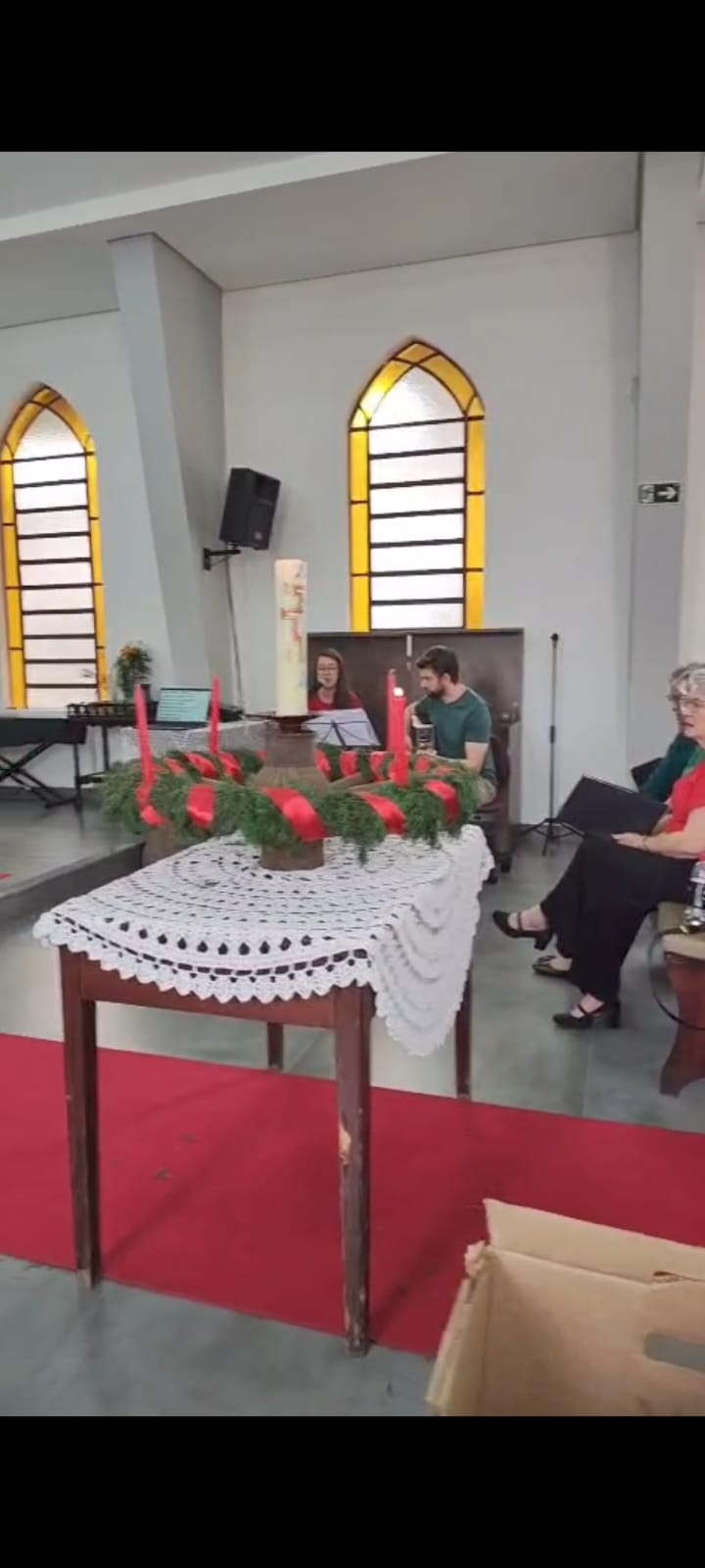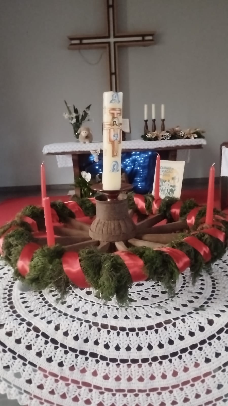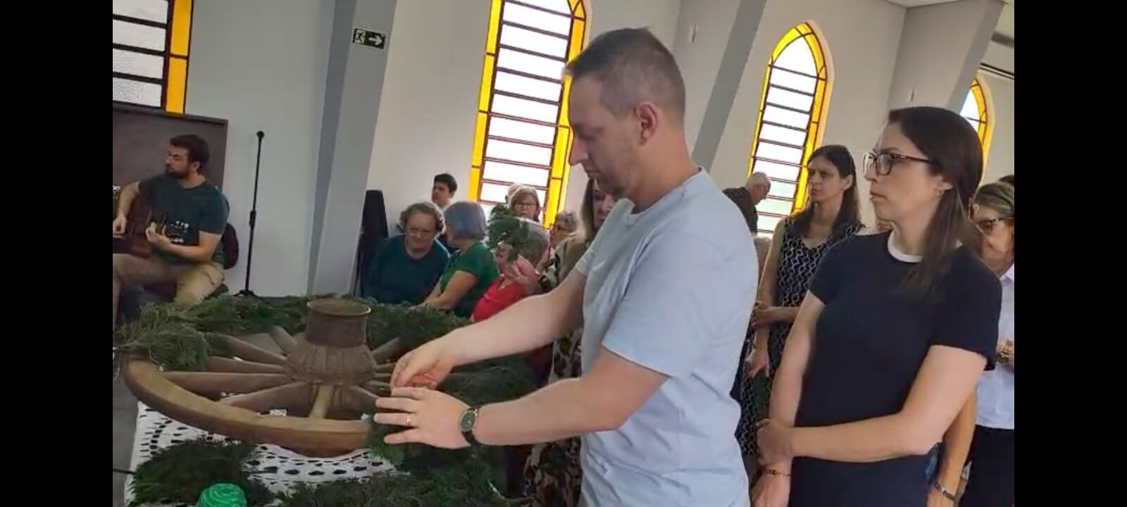 Durante o culto, a comunidade confeccionou, coletivamente, a coroa de Advento, utilizando uma roda de carroça, inspiração trazida a partir da história compartilhada na Oficina de Advento e Natal da IECLB. A proposta, que resgata simbolismos e tradições, aproximou gerações e reforçou o sentido de preparação para a chegada de Cristo.