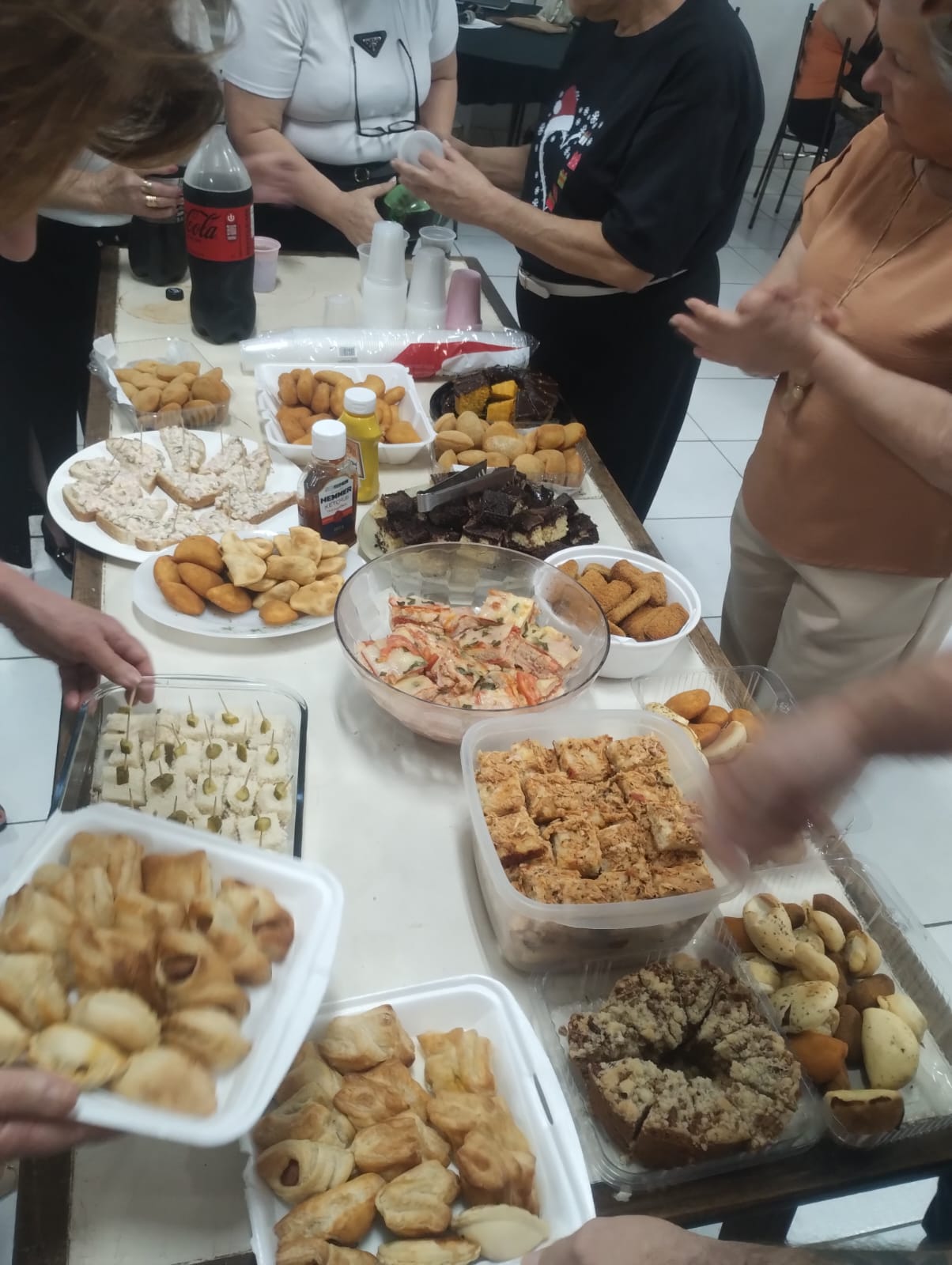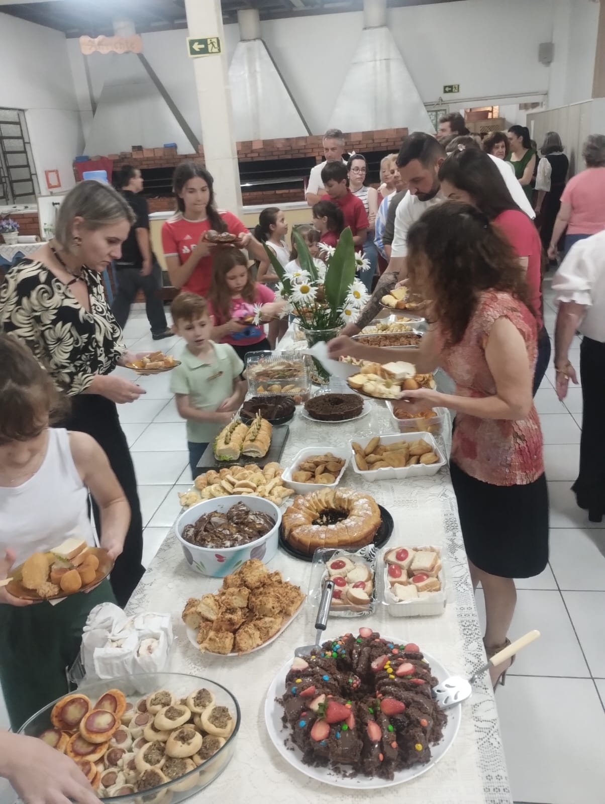 À noite, a comunidade reuniu-se novamente para o Advento em Família, encontro marcado pela partilha, pela cultura e pela expressão dos dons. Cada família levou um prato para compartilhar, fortalecendo os laços comunitários ao redor da mesa.
