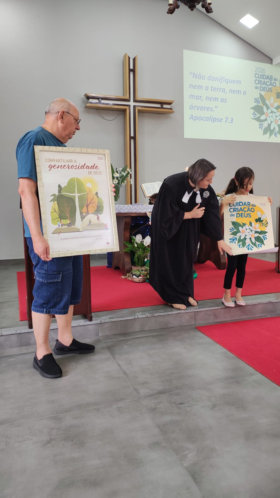 A ornamentação contou ainda com o uso de ramos, lembrando a beleza e a responsabilidade do cuidado com a criação de Deus. Nesse momento especial, foi apresentado oficialmente o tema e lema da IECLB para 2026: “Cuidar da Criação de Deus” e “Não danifiquem nem a terra, nem o mar, nem as árvores” (Apocalipse 7.3), respectivamente.