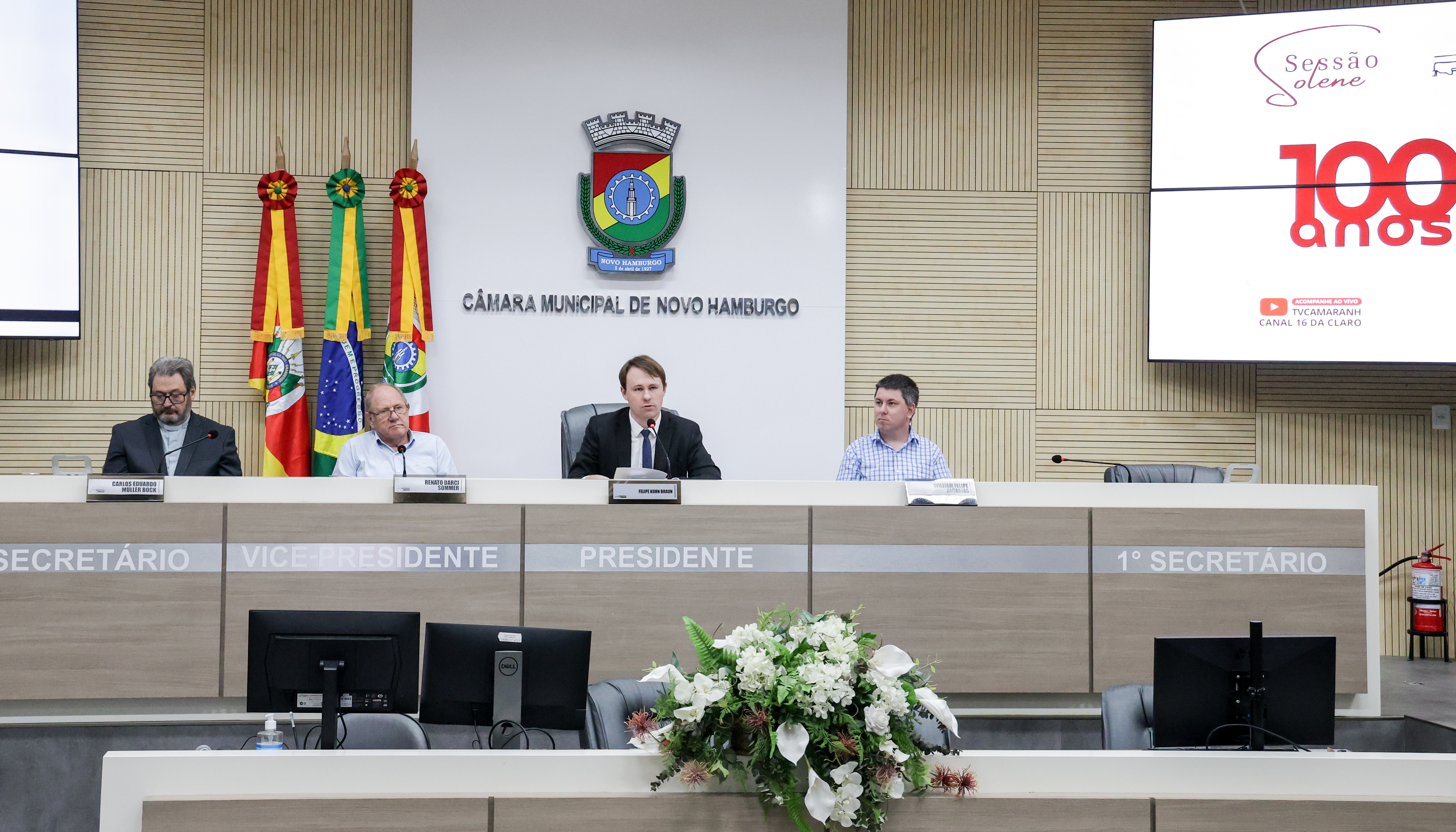A Câmara de Vereadores de Novo Hamburgo realizou, na noite do dia 26 de fevereiro, sessão solene em homenagem aos 100 anos do atual templo da Igreja Três Reis Magos, da Comunidade Evangélica de Confissão Luterana de Hamburgo Velho. A iniciativa partiu da bancada do PSDB, por meio do vereador Felipe Kuhn Braun, e reuniu edis, autoridades religiosas e representantes da Comunidade no plenário da Câmara.